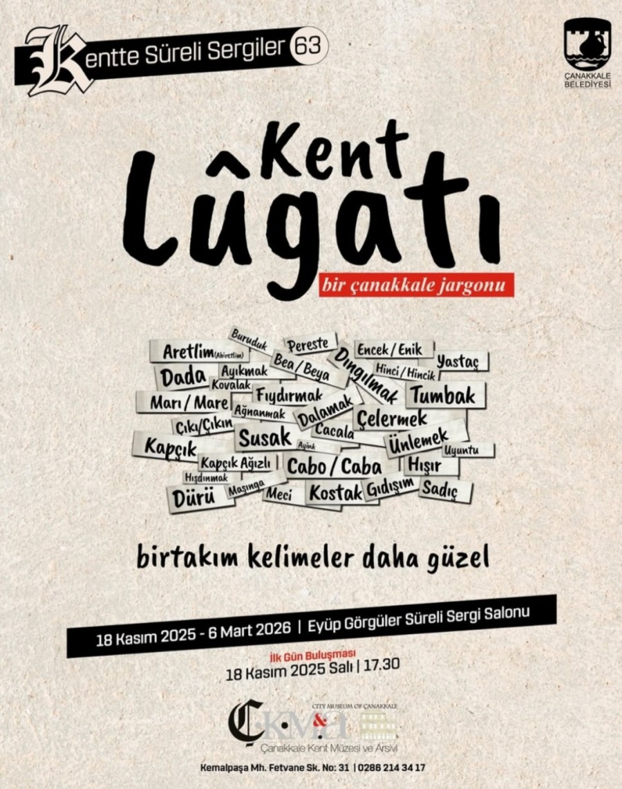 Çanakkale Kent Müzesi tarafından gerçekleştirilen "Kentte Süreli Sergiler"in 63.sü bölümümüz öğrencilerinden Özgül Keloğlu tarafından düzenleniyor. "Kent Lûgatı - Bir Çanakkale Jargonu" başlıklı sergi, Çanakkale'nin gündelik hayatında dolaşan kelimeleri bir araya getirerek kentin ruhunu görünür kılmayı amaçlıyor.